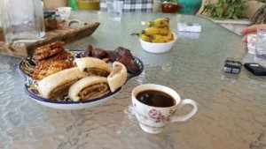 Ahogy kiérünk a “belváros” zegzugos utcáiból, ahol fejkendőt hordanak a nők, egyre több hatalmas házat, szinte palotát látunk, szépen rendezett kertekkel, karbantartott utcákkal. Megtaláljuk a házat is, majd pár perc tanácstalankodás után kiderül, hogy igen, ide jöttünk. Beinvitálnak, a házigazdánál ott van három vendég is. A vendégek láthatóan indulásra készek, de ahogy megérkezünk, ők is leülnek velünk a szép, árnyékos verandára, ahol az asztalon hideg víz van egy kancsóban és egy tálcán sütemények, datolya és mandula.